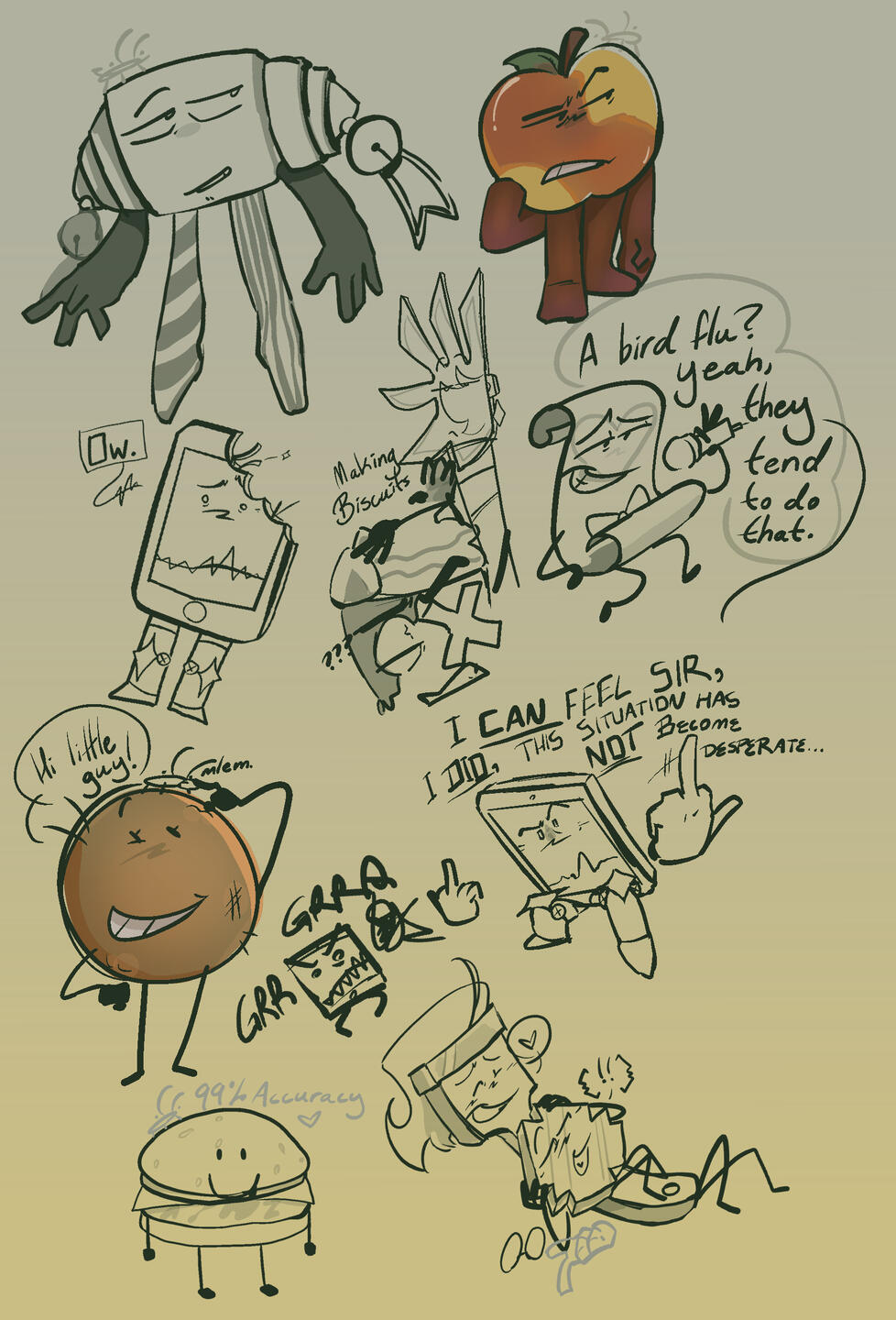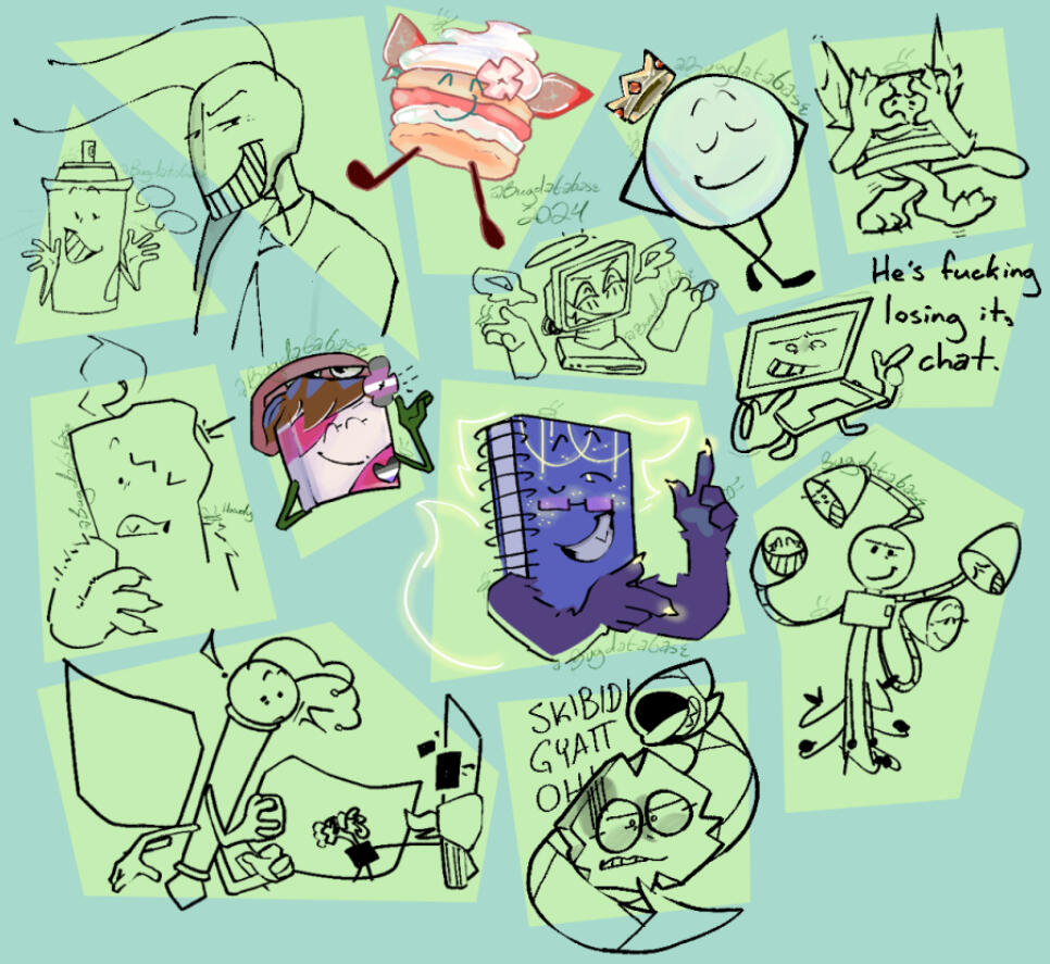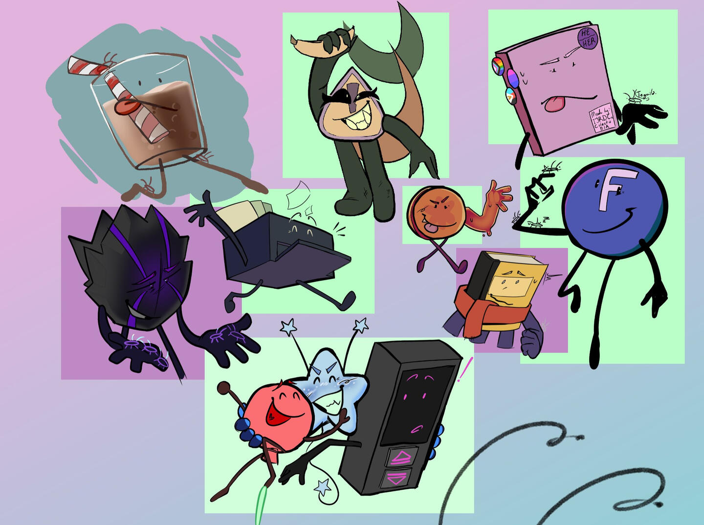 I usually draw gijinka (humanized) versions of characters, busts, robots, and usually something that has to do with Inanimate Insanity.I take drawing requests sometimes, but you have to be following me. They're requests, not commissions! I have the right to decline if I wanna. its the internet <3